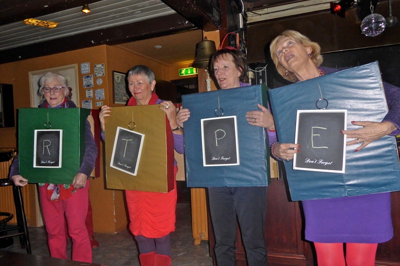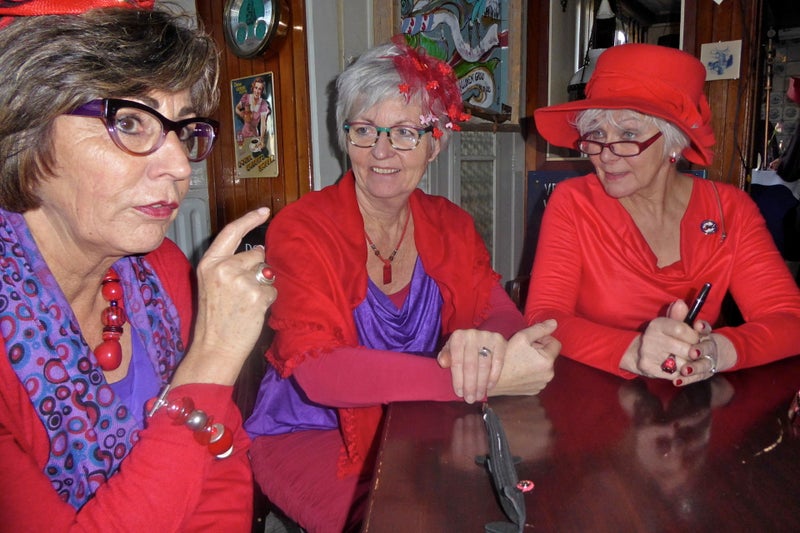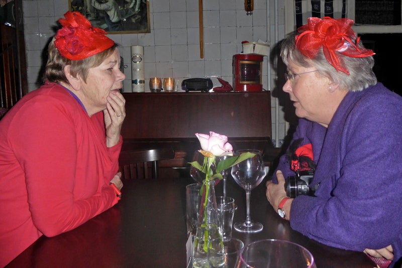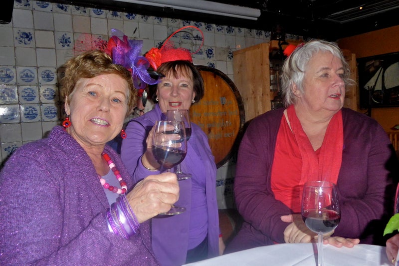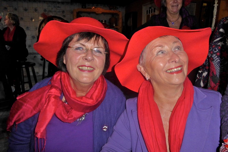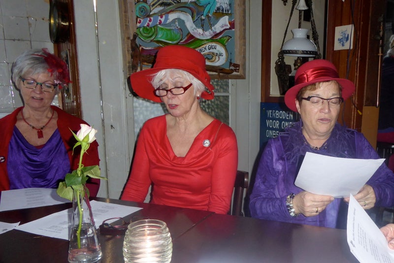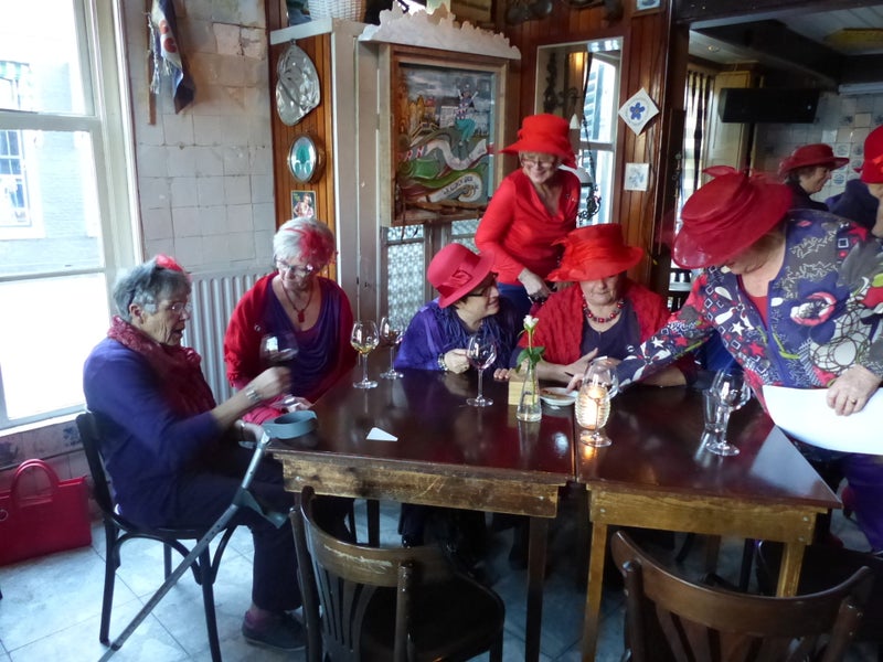 Met tassenvol komen de ladies om twee uur binnen bij onze stamkroeg d’Oude Oost: paarse en rode broeken, jasjes, hoeden, rokjes, sjaals, schoenen etc. etc.