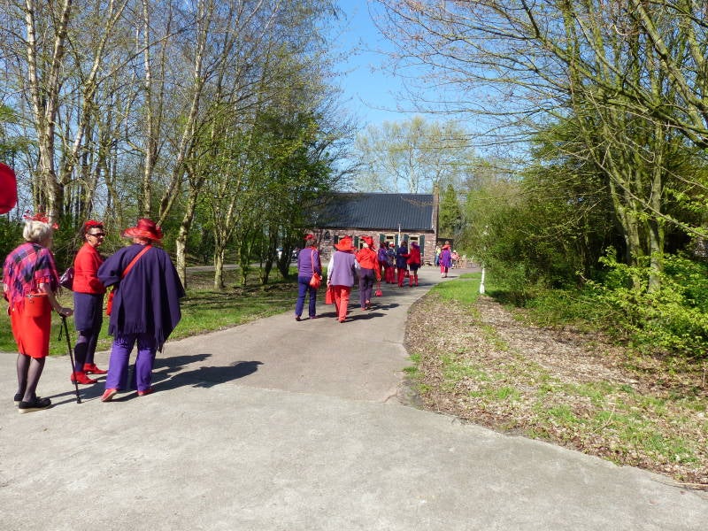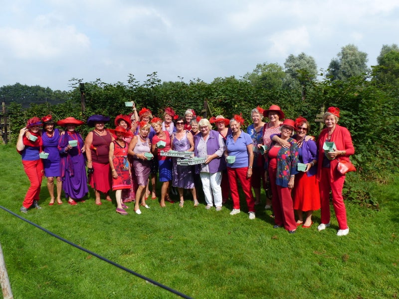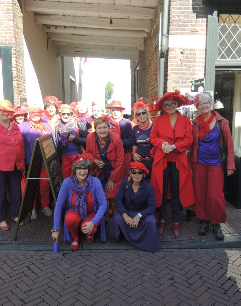 Het was een mooie nazomer-dag, zodat de rood-paarse outfit van de 14 dames goed tot zijn recht kwam in de Hoofdstraat van Beetsterzwaag.