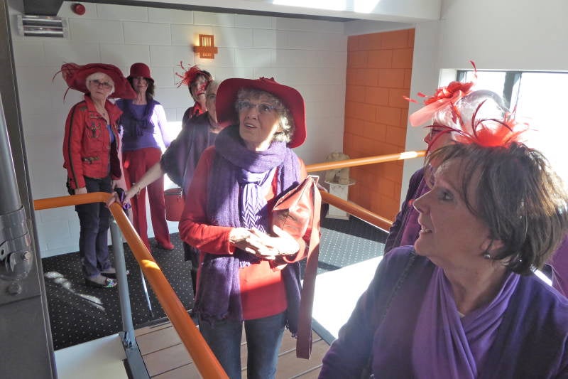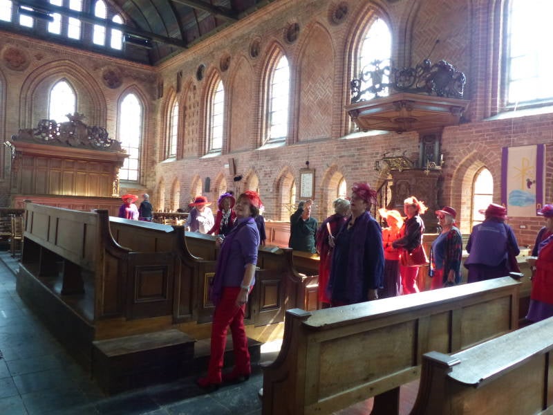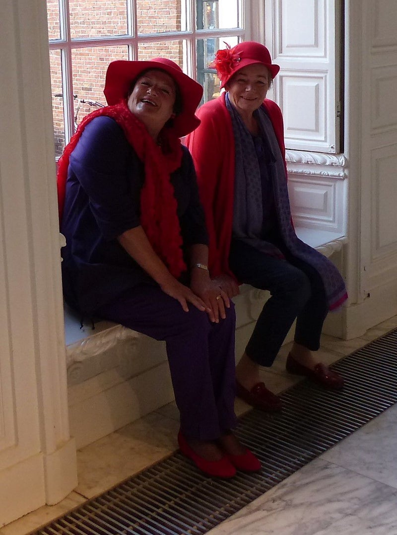 In Aldtsjerk was er een warm onthaal aan de Van Sminiaweg bij Elise. Koffie, thee en heerlijke taarten gebakken door Yvonne, Greet en Gelske nam heerlijke bonbons mee. Elise stelde voor dat iedereen voor z’n buurvrouw zou zorgen, dan kon een ieder genieten. En dat genieten was te zien en te horen. Maar, we waren niet gekomen om alleen maar te drinken en te praten, nee, we hadden een opdracht. `Simply Red` moest op zoek naar het elfde gebod en dat kon nog wel moeilijk worden. Dus jassen aan paraplu’s op en op pad. Onder leiding van onze gids Elise gingen we op zoek. Eerst naar het Dorpshuis. Hier een prachtige diapresentatie over de omgeving van de Trynwâlden,ingesproken door Hans Wiegel. Je zag de hoedjes genieten van de mooie beelden . Ook naar de opsomming van de 10 geboden . Gij zult niet enz. enz. werd aandachtig geluisterd. Hadden we de aanwijzing voor het elfde gebod misschien gemist? Door naar de kerk. Van oorsprong katholiek maar nu protestants. De buitenkant met “littekens`van de tijd. Verschillende soorten stenen. Ooit grote ramen,een teken van rijkdom, dan weer kleine ramen, dit betekende minder belasting betalen. In de kerk nog de opstelling van vroeger. De stoelen voor de rijken en de harde banken voor de vrouwen. In de gangpaden de `rijke stinkerds` en niet te vergeten het mooie orgel. Hier misschien een aanwijzing voor het elfde gebod? Er was nog steeds onzekerheid of we het zouden vinden, maar och we hadden toch een mooie middag en iedereen genoot. Als laatste naar café de Moarkswâl. Een drankje en een hapje, wisselen van plaats om met ieder nader kennis te maken en het oefenen van de namen. Het was echt genieten en de meeste rode hoedjes maakten zich niet meer druk over het elfde gebod. Totdat Elise het woord nam en vroeg of wij het elfde gebod hadden gevonden. Daar was niet iedereen zeker van en Elise liet ons niet langer in spanning.