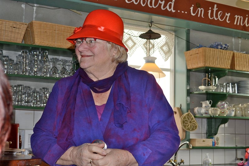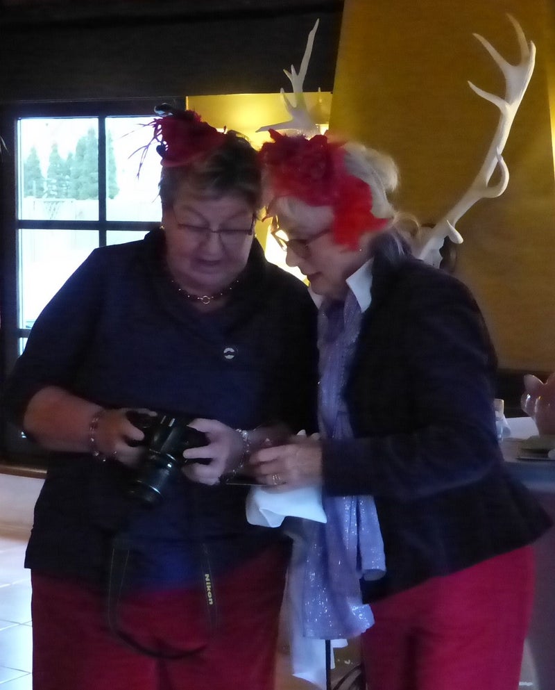 Drieserée en Marijke als getalenteerde en bevlogen verkoopsters; iedereen van de 22 aanwezige Red Hats gaat wel met één of meerdere vondsten naar huis.