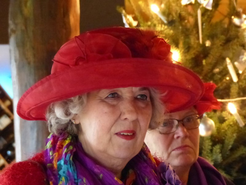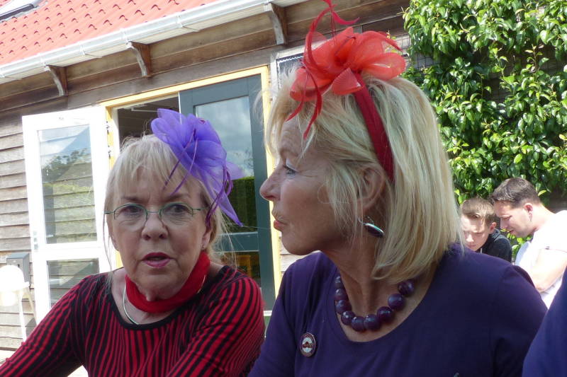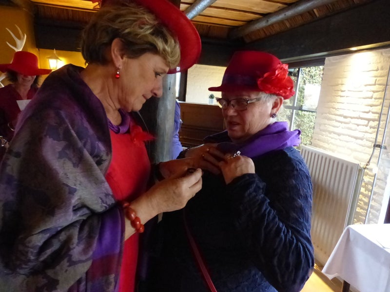 Zondagmiddag 6 maart kwamen we weer bij elkaar, weer in ons bekende café “d’ Oude Oost”. Deze middag gingen we onze rode hoeden opleuken, pimpen, versieren, opsmukken; kortom met veel rood en paars de hoeden nog feestelijker en uitbundiger maken, onder deskundige en creatieve begeleiding van Drieserée en Yvonne. Zelfs voordat queen Antonia de bijeenkomst opende waren al diverse redhatters druk met naald en draad om bloemen, veren en strikken op hun hoeden te knutselen ! Het resultaat oogstte bewondering alom, en ach; die paar half gelukte creaties, besmuikt in een tas gestopt, zijn de moeite van het noemen niet waard... Na een ronde drankjes en hapjes ging Gerie Annemarie opmaken. Met haar jarenlange ervaring als huidverzorging-specialiste wist ze ons te boeien met inspirerende verhalen over permanente en semi-permanente behandelingen in de strijd tegen onze aftakelende schoonheid. Inderdaad, alles gaat zakken, behalve het tandvlees...