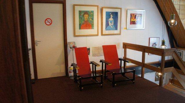 Na het verzamelen buiten in het zonnetje worden we in 2 groepen verdeeld. Erna Jansen, één van de oprichters, laat ons meteen in twee Rietveld stoelen zitten, uiterlijk nagenoeg gelijk, maar we laten ons niet bedotten : de linker stoel zit beduidend beter !