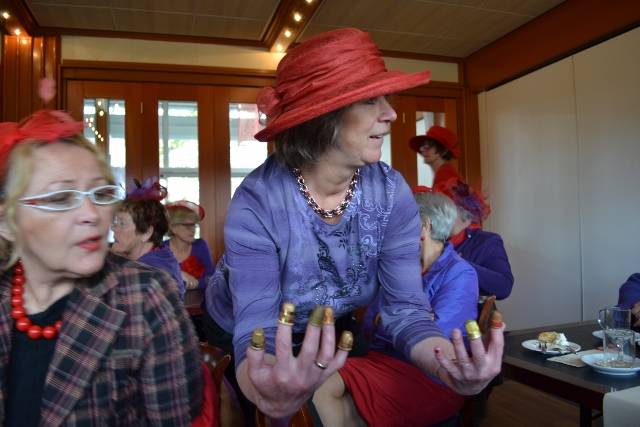 Vanonder onze rode hoeden volgen we geboeid haar verhaal over haar (vinger)hoeden.