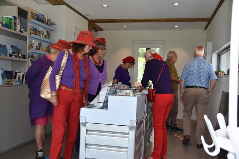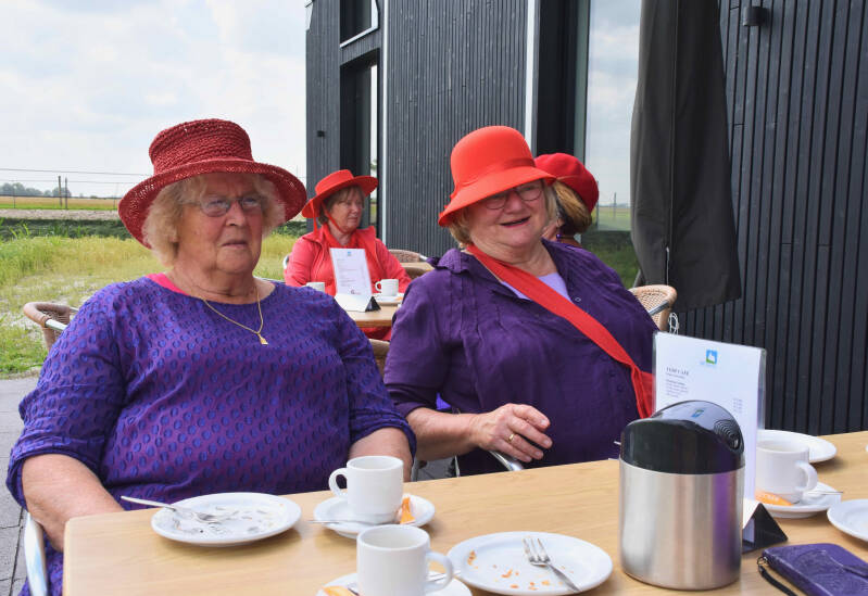 We hebben versnaperingen en bier en bubbels meegenomen, maar worden ook nog ontvangen met koffie en taart in het bezoekerscentrum van Hegebeintum.