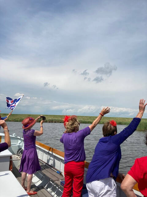 Er komen vliegtuigen voorbij t.g.v. de onthulling van het monument bij Molkwerum voor gevallen vliegeniers in 2de WO. De dames staan te zwaaien.